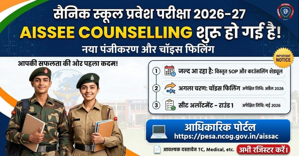 The All India Sainik Schools Entrance Examination (AISSEE) 2026 is conducted for admission to Class 6 and Class 9 in Sainik Schools and New Sainik Schools across India. The exam is organized by the National Testing Agency (NTA), while the counselling process is managed by the Sainik Schools Society through the AISSAC e-counselling portal.