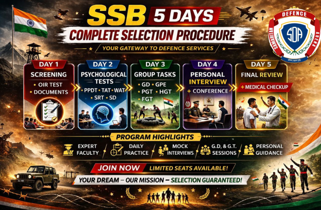The final stage of the SSB 5-day procedure is the Conference Round, where all assessors, including psychologists, GTOs, and interviewing officers, discuss and evaluate the candidate’s overall performance. Candidates are then informed about their selection status.
